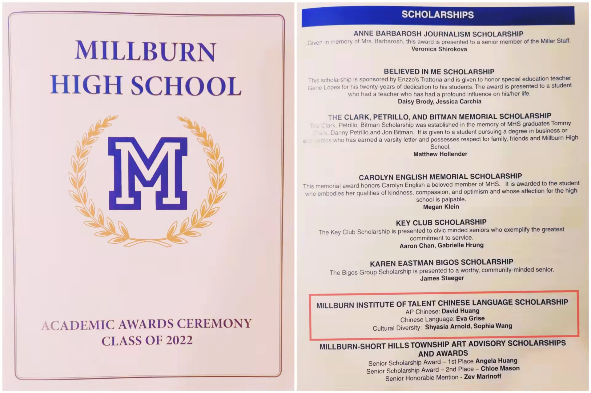 - Millburn Institute of Talent AP Chinese Star (2 winners; selected from Millburn High School’s AP Chinese class; $200 each)